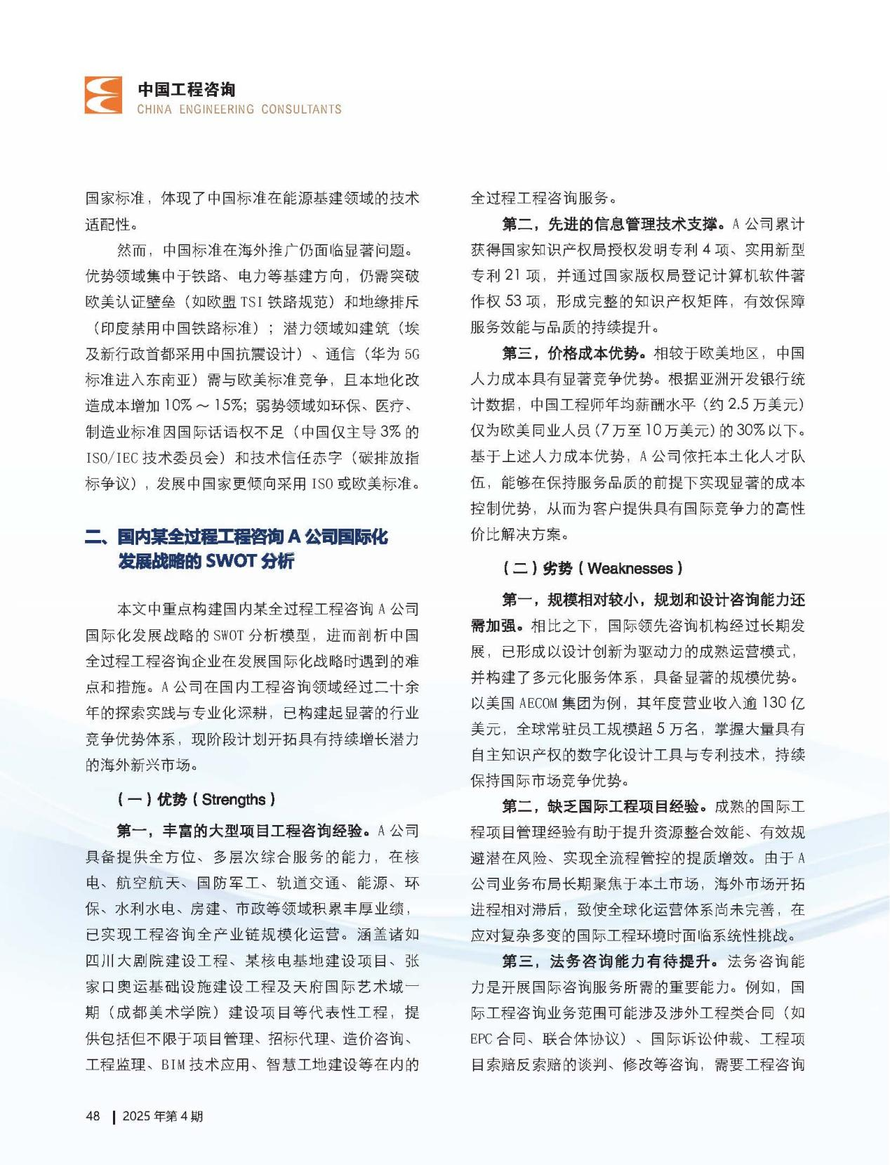 文章基于波特五力模型、PEST模型和SWOT分析,全面剖析了国际工程咨询行业的竞争格局与发展趋势。研究发现,尽管欧美企业在国际市场中占据主导地位,但中国工程咨询公司在亚洲、非洲等新兴市场已取得显著突破。然而,国际化经验不足、技术标准差异等问题仍是制约企业发展的主要短板。