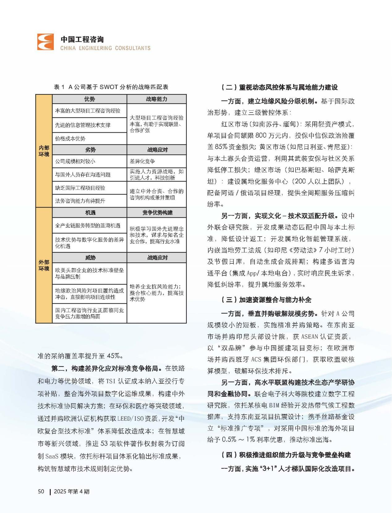文章提出,国内工程咨询企业应依托援建项目积累经验,通过构建战略联盟或兼并重组拓展资源。同时,差异化竞争与人才战略是提升核心竞争力的关键。企业需在技术、服务和管理模式上不断创新,打造具有国际竞争力的品牌形象。