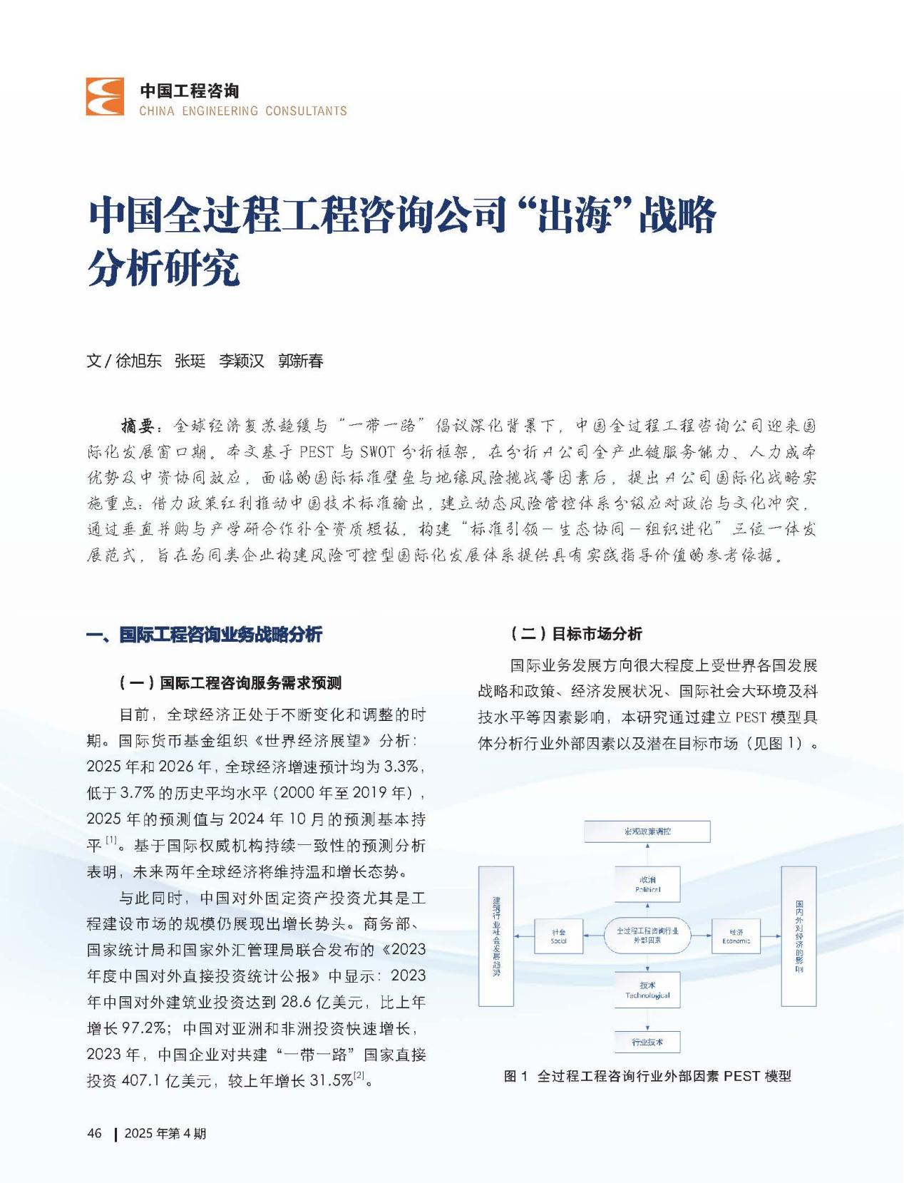 随着“一带一路”倡议的深入推进,中国工程咨询企业正迎来前所未有的国际化机遇。然而,面对当今复杂多变的国际竞争格局,如何制定科学有效的海外战略,成为行业关注的焦点。近日,晨越建管集团院士工作站在《中国工程咨询》杂志“晨起全咨·越达未来”专栏刊发了一篇题为《中国全过程工程咨询公司“出海”战略研究》的专业文章,为国内工程咨询企业布局海外市场提供了重要的理论参考与实践路径。