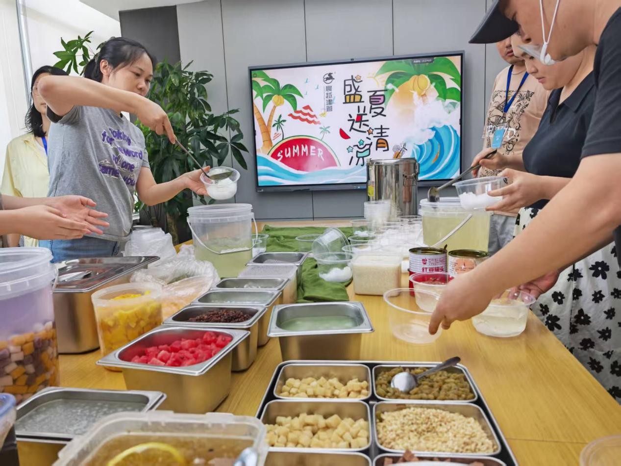 本次活动以“清凉一夏,关爱同行”为主题,运营管理部特别邀请到技艺精湛的冰粉师傅亲临现场。同事们与师傅相互配合,将传统冰粉与新鲜水果、红豆、葡萄干、花生碎、红糖水等丰富配料巧妙融合,制作出一碗碗晶莹剔透、清凉解暑的冰粉。清甜的香气弥漫在会议室中,瞬间驱散了夏日的燥热。同事们有序排队领取,在忙碌的工作间隙享受这份沁人心脾的凉爽。一碗碗冰粉不仅带来了舌尖的愉悦,更传递着集团对员工无微不至的关怀,现场欢声笑语不断,其乐融融。