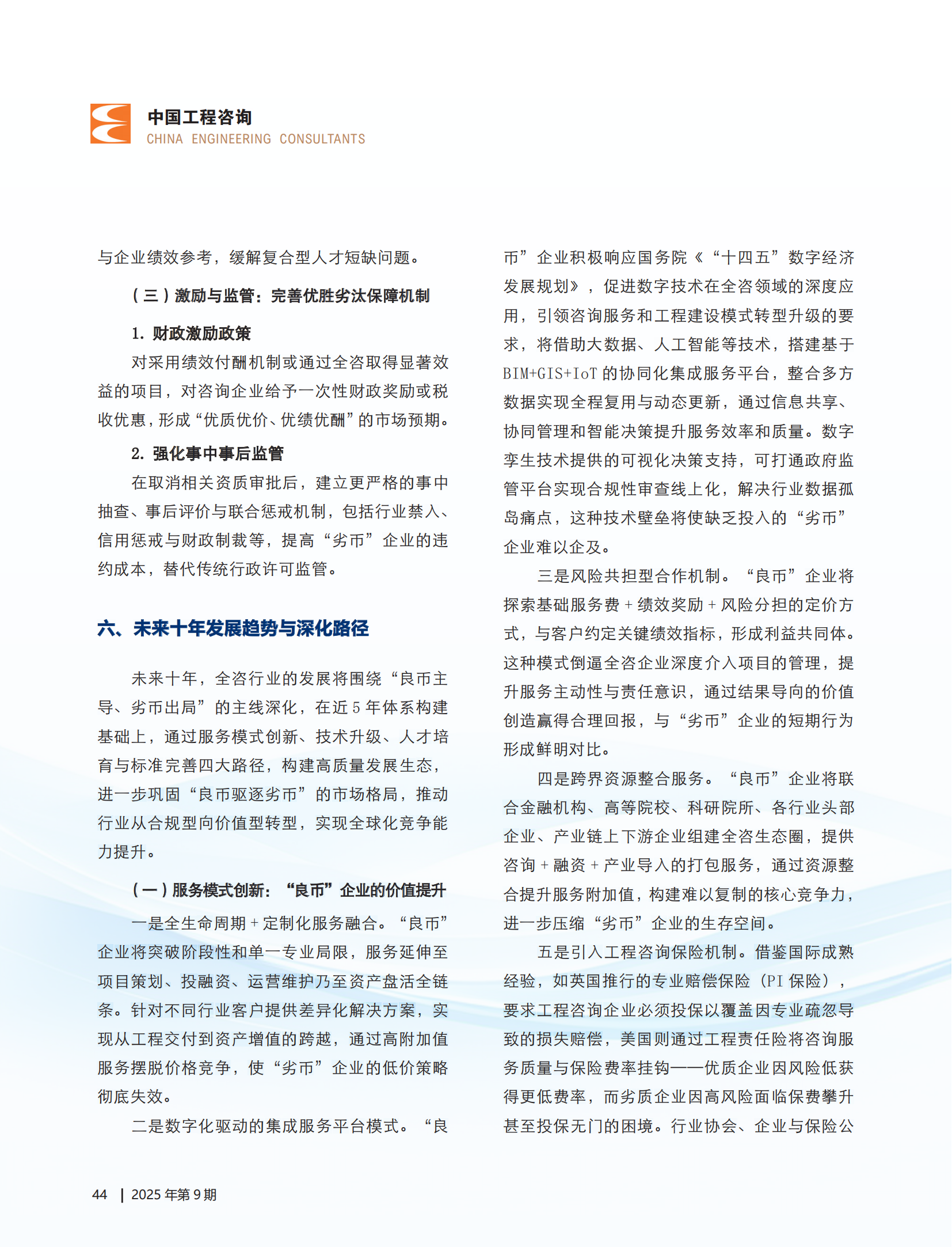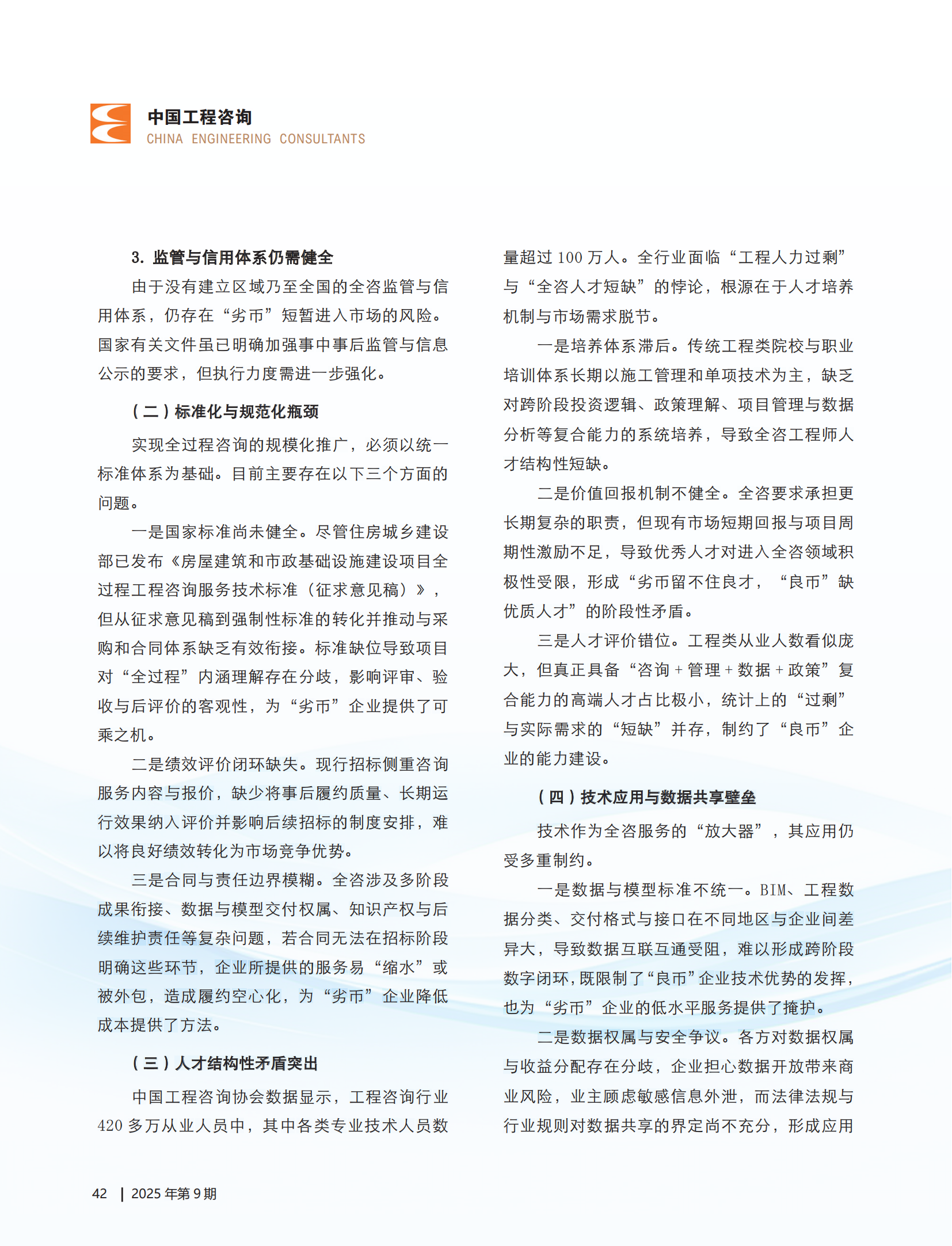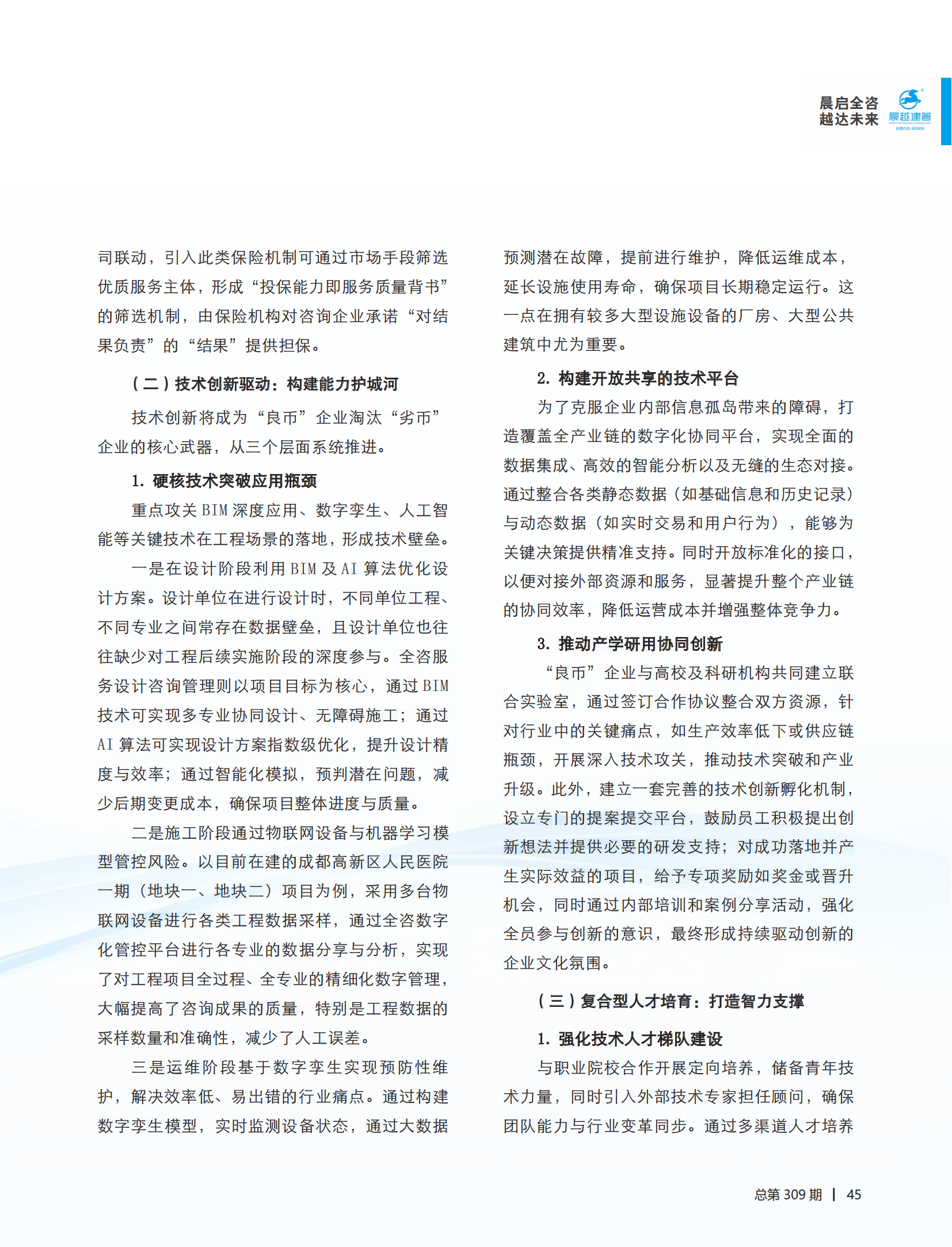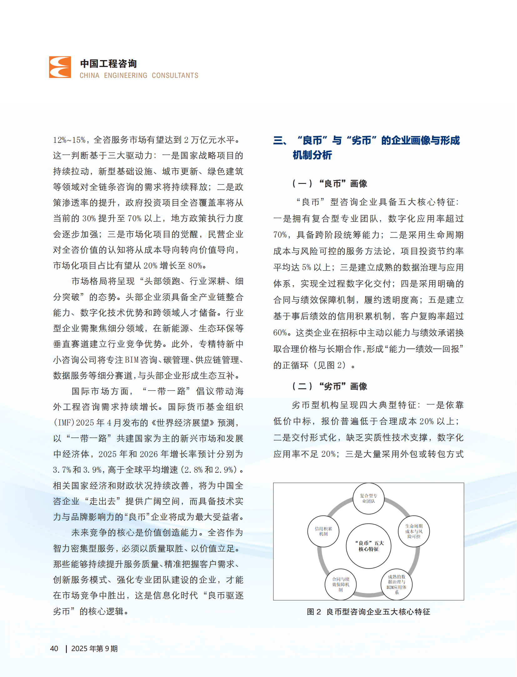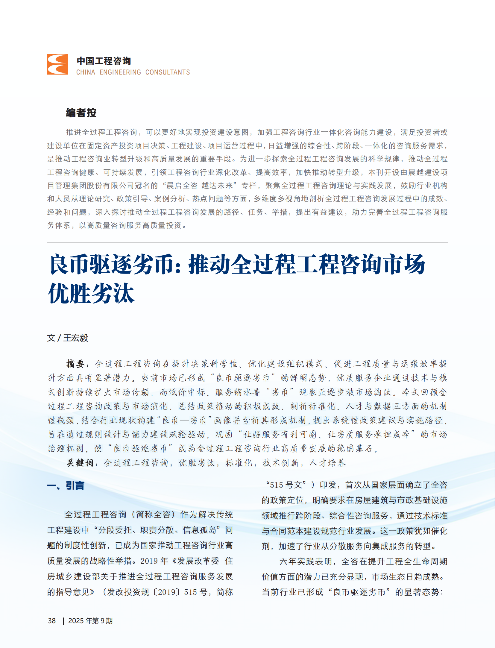 近日,集团党委书记、董事长王宏毅署名文章 ——《良币驱逐劣币:推动全过程工程咨询市场优胜劣汰》在行业权威媒体《中国工程咨询》杂志刊发。文章围绕全咨市场“良币驱逐劣币”这一核心主题,以前瞻性战略视角深刻剖析全过程工程咨询市场发展瓶颈,为构建“良币主导”市场机制提供了具有理论高度和实践价值的解决方案。文章一经发表,便引发业内广泛关注与热烈讨论。