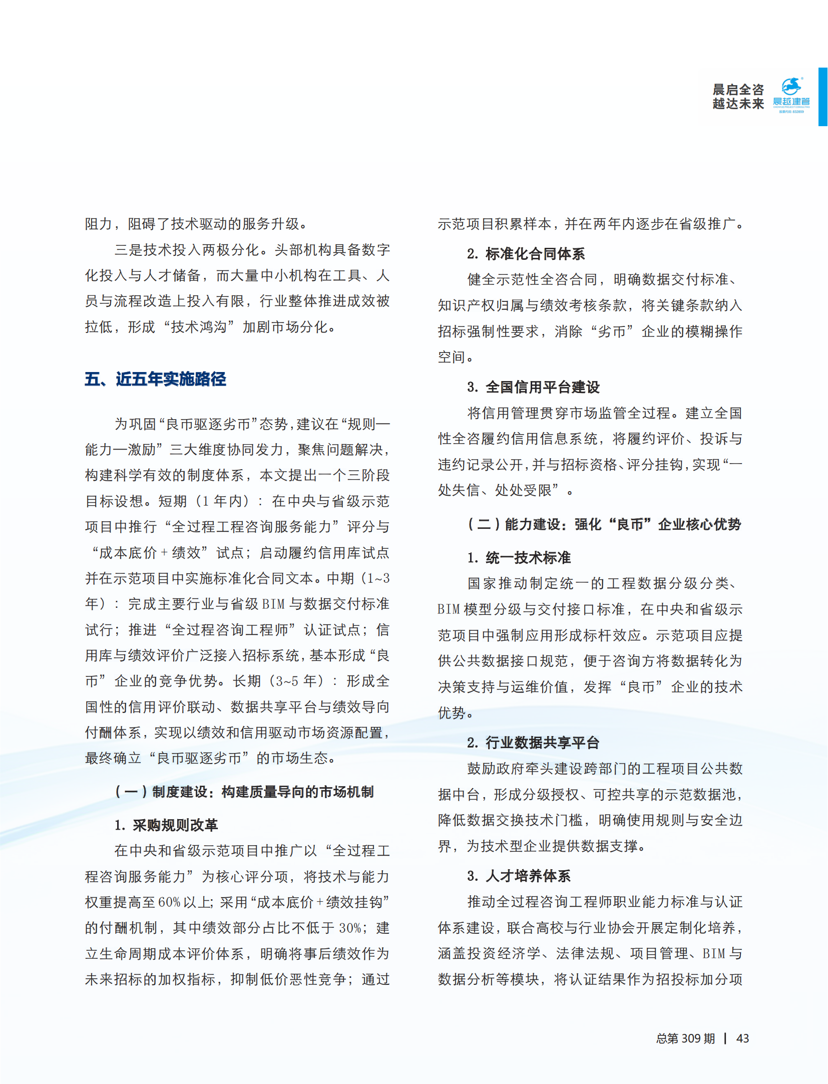 文章聚焦全咨市场 “良币驱逐劣币” 核心逻辑,观点突出、内容扎实:其一,针对当前全咨市场存在的政策落地不均衡、标准化瓶颈、人才结构性短缺、技术应用壁垒等痛点问题,作者结合中国工程咨询协会等权威机构发布的数据,以及晨越建管数字化管控平台的实践案例,清晰拆解 “良币” 与 “劣币” 的鲜明画像及形成机制,并创新性提出 “规则构建 — 能力建设 — 激励监管” 三位一体的解决方案,为全咨市场痛点破解明晰路径;其二,文章前瞻性预判未来十年全咨市场发展趋势,指出到 2035 年全咨市场规模有望突破 3 万亿元,头部企业将通过服务模式创新、技术迭代升级、复合型人才培养实现领跑,为业内企业指明转型方向与发力重点;其三,文章兼顾专业性与可读性,既保留了工程咨询领域的专业深度,又通过数据图表、案例解读等形式降低理解门槛,确保政策制定者、企业管理者、一线从业者均能从中有所启迪。