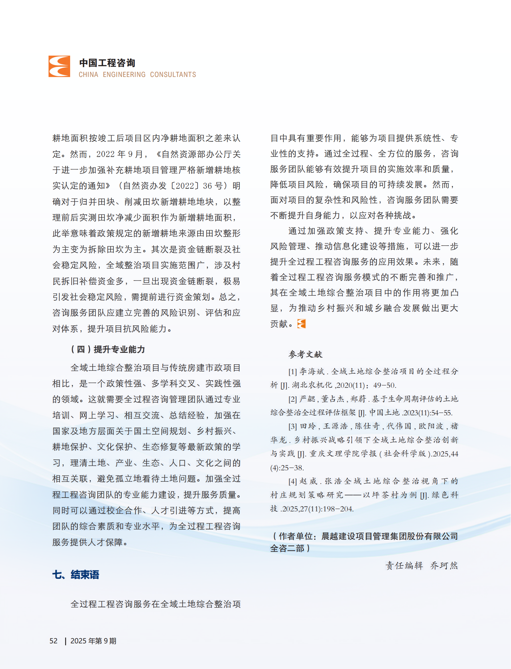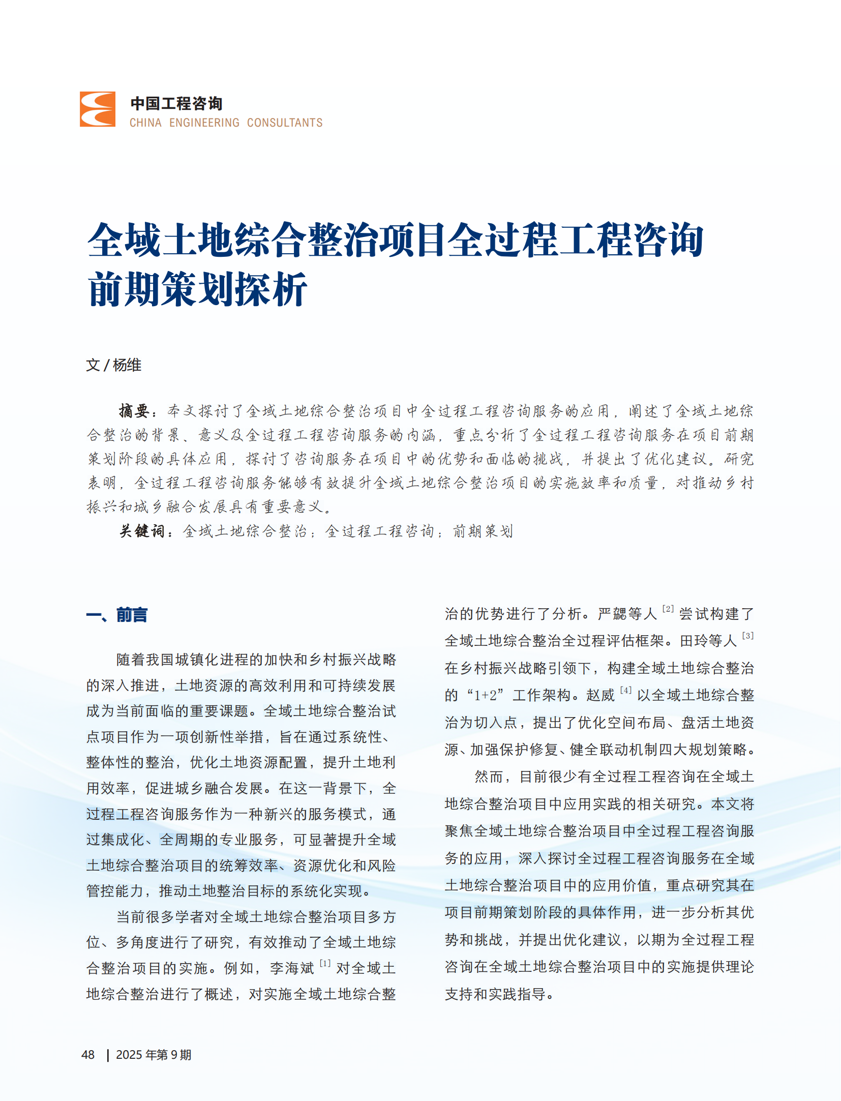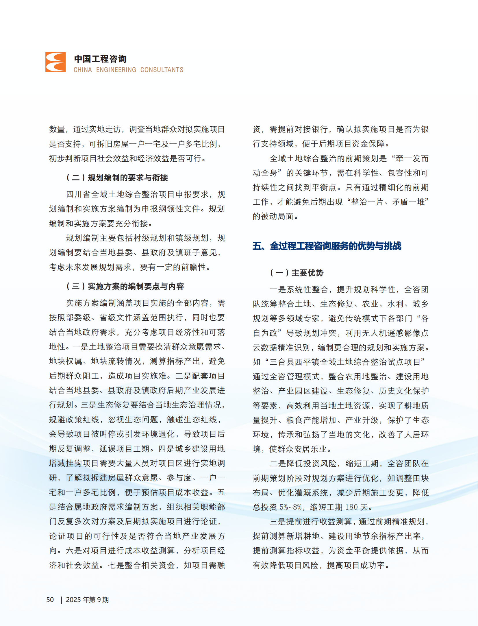 近日,集团以四川绵阳三台县全域土地综合整治项目为研究对象的专题文章在《中国工程咨询》杂志2025年第9期发表。该文章立足实践案例,深度剖析了全过程工程咨询前期策划环节在全域土地整治项目中的核心价值。