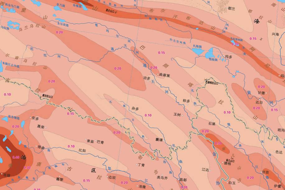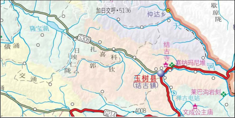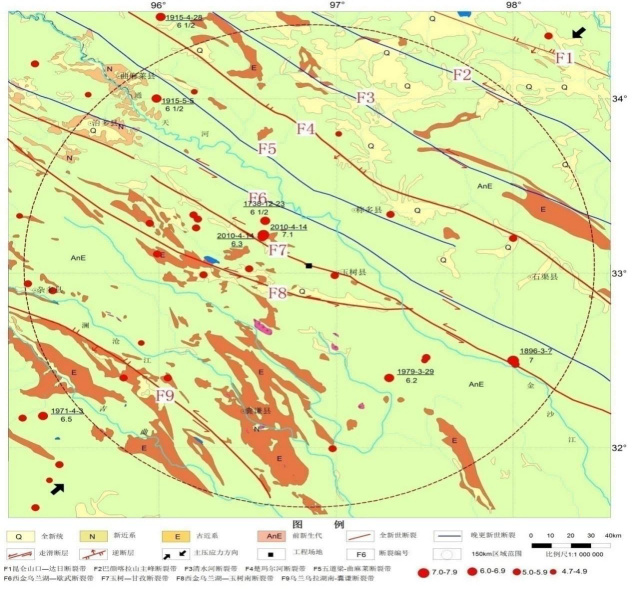 国庆水库工程位于玉树市果青沟西沟唐古拉准地台北部的巴塘台缘褶带部位,主要河流有巴塘河和扎西科河,二者在结古镇汇合后以下河段称之为扎曲河,最终注入通天河,属长江上游通天河水系。工程周边主要由两岸山地、河床滩地及坡地构成(如图3-1所示)。由于本区域距两个一级构造单元唐古拉准地台分界的乌兰乌拉湖~玉树南深大断裂带(26km)和玉树~甘孜断裂带(1.4km)较近(图3-2、图3-3)。