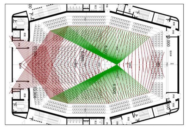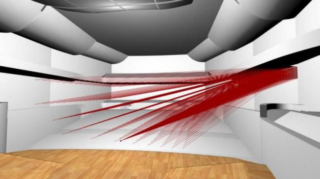 为满足观演厅的声学标砖,利用ODEON软件,结合声学装饰BIM模型进行观演厅的三维声场模拟分析。通过声学反射分析结果对天花和墙面装饰造型和材料优化,调整观众席区域反射声音的覆盖范围,使舞台发出的声音均匀分布在整个观众席区域内,达到理想声学效果。