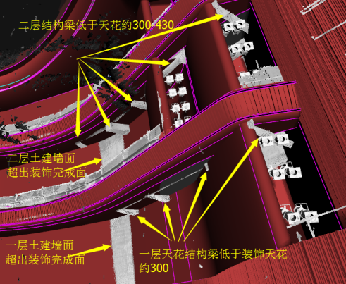 为避免精装修与土建结构的冲突碰撞,精装修施工前对现场土建完成结构进行实测复核。通过三维激光扫描仪对观演厅内土建结构进行实测扫描,获得厅内三维点云数据模型,结合装饰装修的BIM模型,进行主体结构与装饰设计造型的碰撞检查。
